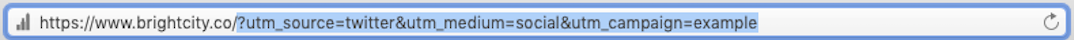 Your URL will look like this: https://www.brightcity.co/?utm_source=twitter&utm_medium=social&utm_campaign=example